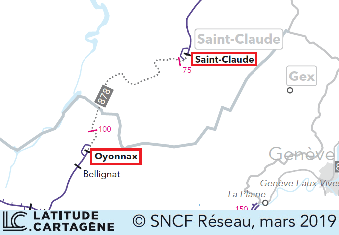 Die 123km lange Bahnstrecke von Andelot-en-Montagne nach La Cluse ist seit Dezember 2017 nicht mehr durchgängig mit dem Zug befahrbar. Auf dem mittleren 31km langen Abschnitt zwischen den Bahnhofen Oyonnax und Saint-Claude wurde der Zugverkehr wegen mangelnder Wartung eingestellt. Mit der Region Franche-Comté konnte keine Finanzierung vereinbart werden. Nun sind die Bahnhöfe Saint-Claude und Oyonnax zu Kopfbahnhöfen geworden. Eine durchgehende Reise kann nun nur noch mit einem Umstieg auf den Bus angeboten werden. Vermutlich werden durch diesen Zwangsumstieg die Fahrgastzahlen weiter absinken.
