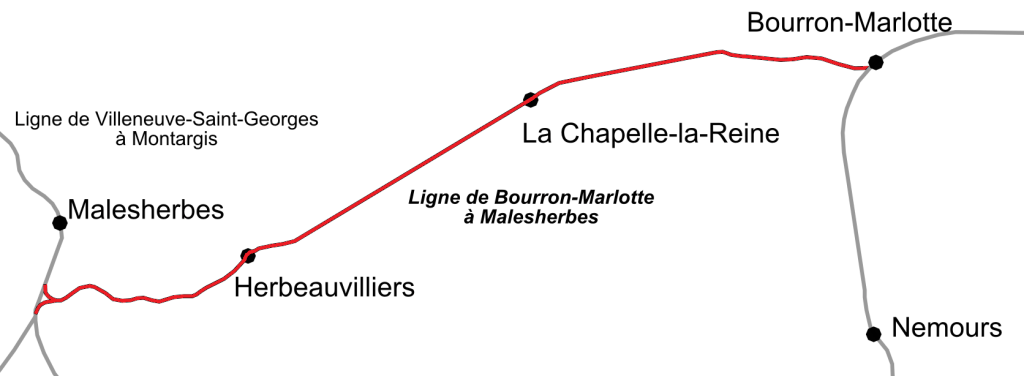 Die 26,150 Kilometer lange Bahnlinie vom Bahnhof Bourron-Marlotte-Grez nach Malesherbes wurde im Jahr 1881 eröffnet, nachdem die Bauarbeiten im Jahr 1879 begonnen hatten. Bereits im Jahr 1886 wurde die Strecke um ein zweites Gleis ergänzt. 1947 wurde das zweite Gleis wieder entfernt. Der Personenverkehr zwischen Bourron-Marlotte und La Chapelle-la-Reine wurde 1950 eingestellt.