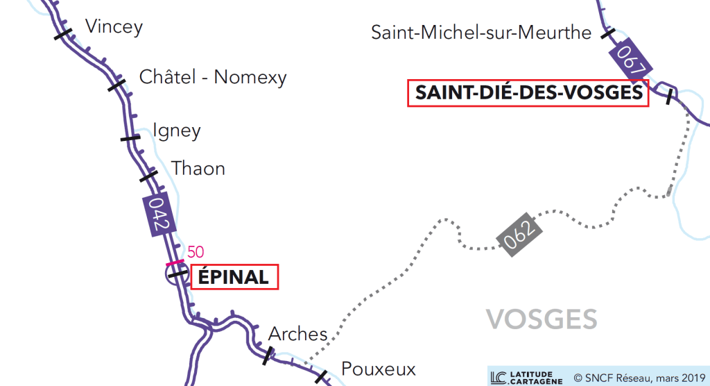 Der erste Abschnitt der Strecke wurde im Jahr 1870 eröffnet. 1874 folgte ein weiterer Abschnitt und zum 7. Oktober 1876 schließlich der Lückenschluß. Die Konzession zum Bau und Betrieb wurde an die Firma Société anonyme du chemin de fer de la Vologne erteilt. Danach wechselte die Strecke weiter den Besitzer und kam über die Compagnie des chemins de fer de l’Est zum 1. Januar 1938 zur neu gegründeten SNCF.