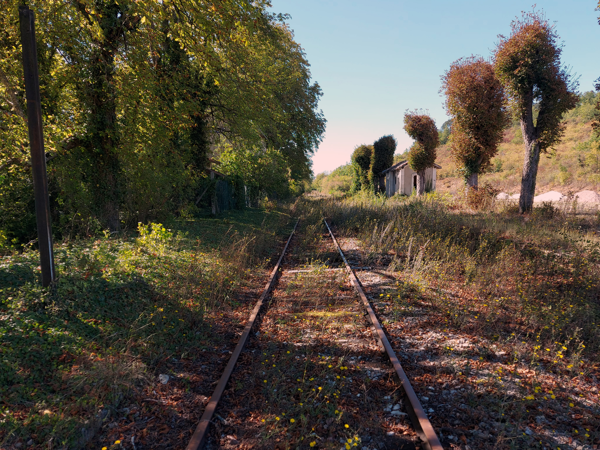Eröffnet wurde der von mir besuchte Streckenteil im Jahr 1893, die Strecke war von Anfang an zweigleisig. Betreiber war die Privatbahn PLM. Der Personenverkehr endete schon im Jahr 1938. In der Besatzungszeit wurde die Strecke 1943/1944 auf ein einzelnes Gleis zurückgebaut (vermutlich auf Veranlassung der Deutschen).