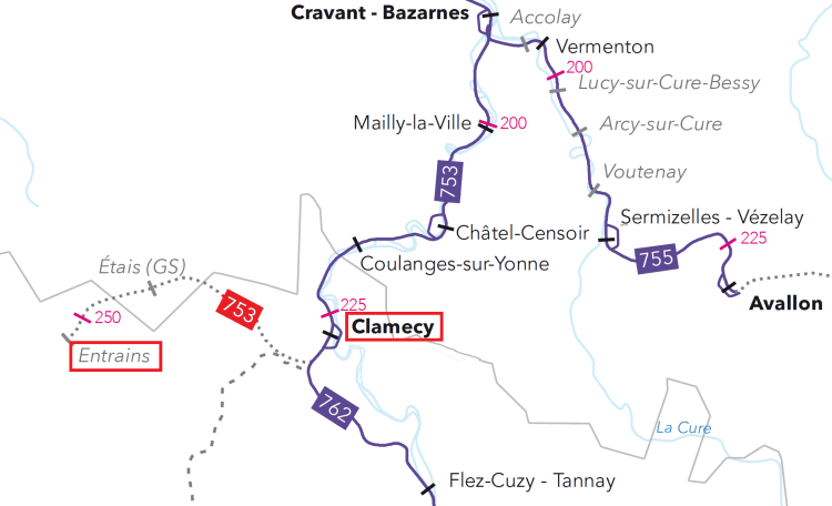 Eigentlich hatte ich noch nicht mit meinen Streckenwanderungen begonnen und weilte nur für eine „normale“ Wanderung in Frankreich. Dennoch kam ich in der Nähe von Nevers nicht umher den Schienen zwischen Clamecy nach Étais-la-Sauvin einen Besuch abzustatten. Die 8 Kilometer zwischen Étais-la-Sauvin und Entrains habe ich mir nicht angesehen, hier wurde der letzte Güterverkehr bereits 2013 eingestellt. Vermutlich ist dieser Abschnitt durch die Vegetation auch schon nicht mehr begehbar. Eine kleine Vorschau gibt es nun hier zu sehen.
