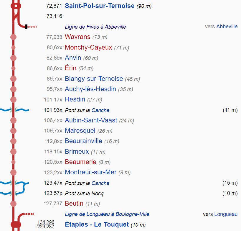 1918 erfolgte bei der Stadt Hesdin der Bau einer 25km langen Strecke nach Frévent. Ebenso kurz vor Etaples, hier gab es in Folge beider Weltkriege ein Verbindungsgleis um Etaples zu umfahren. Große Brücken oder gar Tunnel sucht man auf dieser Linie vergebens. Die Topografie ich nicht weiter erwähnenswert, da die Strecke auf den 61 Kilometer von anfangs 90m auf schließlich nur noch 10m über Null abfällt. Die Kriegshandlungen zweier Weltkriege brachten es mit sich, dass die Schienen oft aus verschiedenen Quellen und heute nicht mehr rekonstruierbaren Gründen zusammengestückelt wurden. So finden sich hier auch wieder Schienen, die den weiten Weg aus den USA hierherkamen. Güterverkehr wird es aus der Linie zuletzt wohl keinen mehr gegeben haben. Einige Bahnhöfe behielten zwar ein Ladegleis, jedoch waren diese alle schon seit einigen Jahren nicht mehr genutzt worden.
