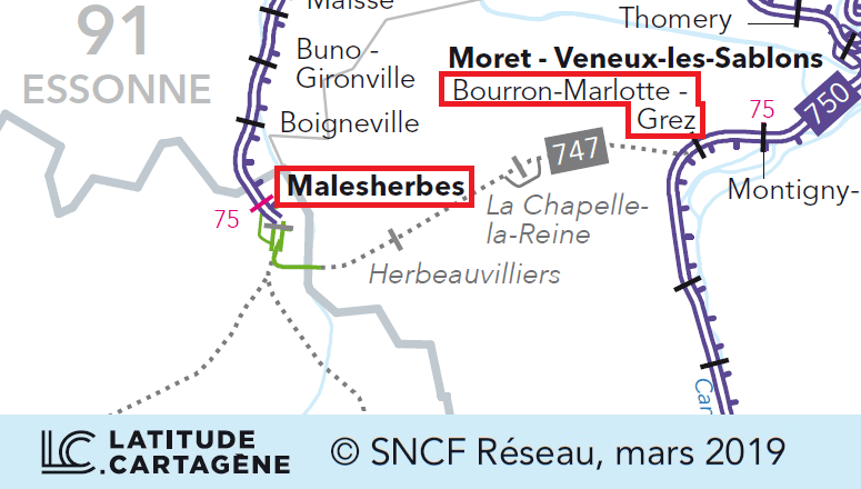 Eine Bahnverbindung zwischen Malesherbes und Bourron-Marlotte-Grez wurde im Jahr 1875 für öffentlichen Nutzen erklärt. Die Konzession wurde der privaten Eisenbahngesellschaft Compagnie des chemins de fer de Paris à Lyon et à la Méditerranée (oder einfach: PLM) gewährt. Die Bauarbeiten begannen im Jahr 1879. Die schließlich 26 km lange Strecke – darunter 22,4 km im Departement Seine-et-Marne – wurde am 24. August 1881 eingleisig eröffnet. Schon 1886 folgte die Erweiterung auf ein zweites Streckengleis. Mit den nun insgesamt drei Strecken südlich von Malesherbes, wurde eine Reihe von Verbindungskurven errichtet, die zusammengenommen zwei Gleisdreiecke ergeben. Damit waren direkte Verbindungen zwischen den einzelnen Strecken gegeben, ohne den Bahnhof von Malesherbes anfahren zu müssen. Vor Beginn des ersten Weltkrieges gab es täglich 4 Zugpaare auf der Strecke.
