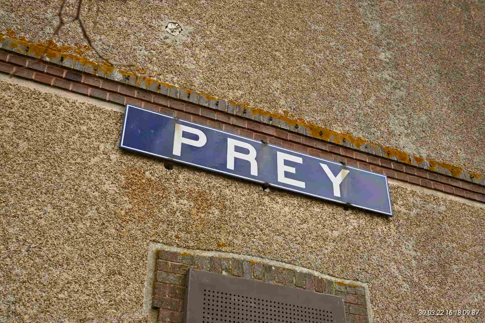 Der Bahnhof von Prey liegt hinter einer fast vollständig gewachsenen Weiche. Hier zweigte ab 1888 die Strecke nach La Loupe ab. Auch auf dieser Bahnstrecke endete der Personenverkehr ab dem Jahr 1938. Der Güterverkehr folgte ab den 50er Jahren. Wie durch ein Wunder sind in Prey der Güterschuppen und das Empfangsgebäude bis heute nicht abgerissen worden. Beide Gebäude dürften aber bald nur noch Ruinen sein, wenn der Verfall so weiter geht…