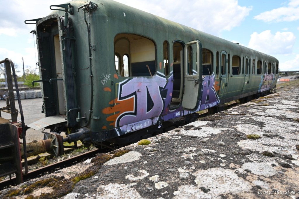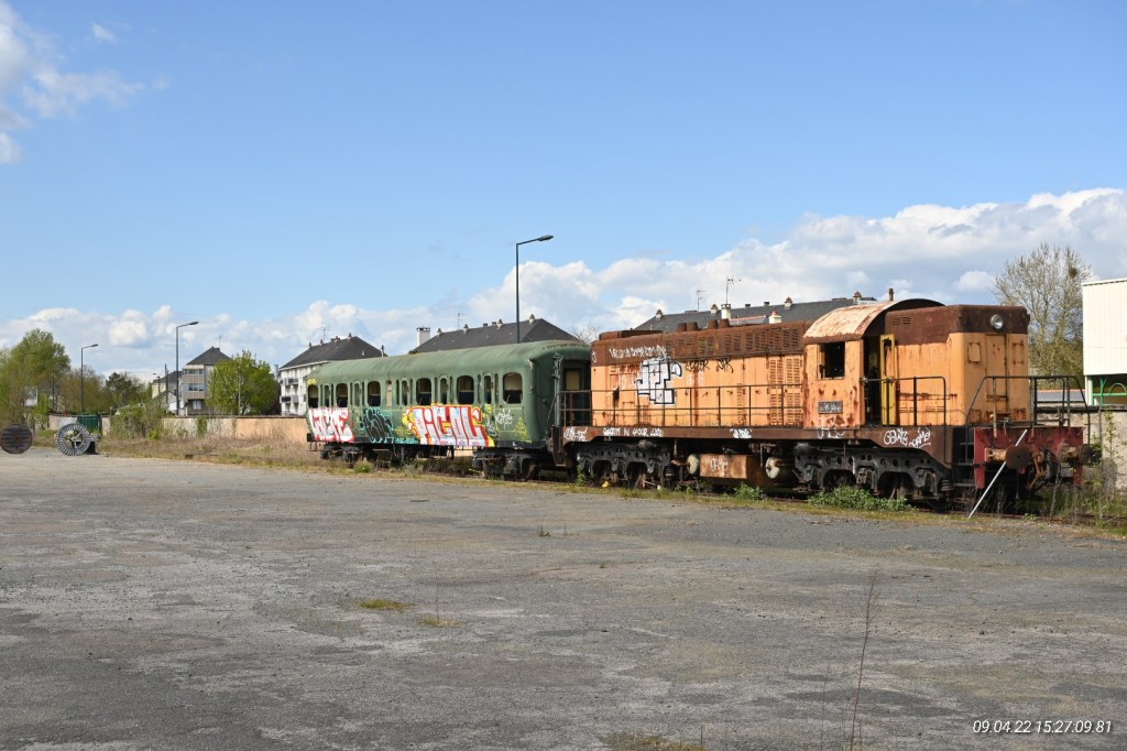 Ausgangspunkt der Streckenwanderung ist der Bahnhof von Saumur.Der Bahnhof liegt direkt an der Loire.Am Bahnhof wohl schon länger abgestellt, steht diese Lokomotive aus den USA (1946/47 gebaut für die SNCF) zusammen mit einem Personenwagen. Beide in keinem guten Zustand. Da ist vielleicht nicht mehr viel zu retten…
