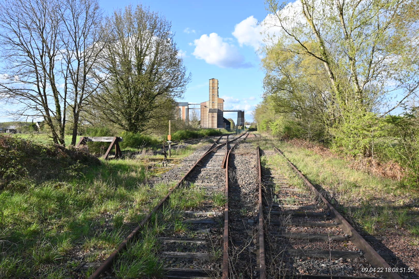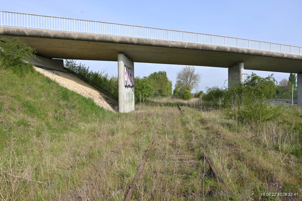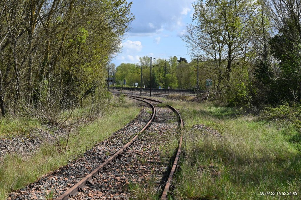 Die wenigen Kilometer von Vivy nach Longue zu den beiden zuletzt noch aktiven Gleisanschlüßen ist von keiner Besonderheit geprägt. Mit dem Bau der Autobahn direkt neben die Bahnstrecke wurden einige Bahnübergänge aufgelöst. Das Streckengleis ist bereits mäßig zugewachsen. Der Abstand der Holzschwellen zueinander ist recht sportlich gewählt und es bedarf schon beherzter großer Schritte, um immer auf die Holzschwellen zu treten. Von kurzen „Tippelschritten“ kann hier keine Rede sein. Vielleicht wollte man damals so die Baukosten niedrig halten, indem man die Zahl der Schwellen reduzierte.