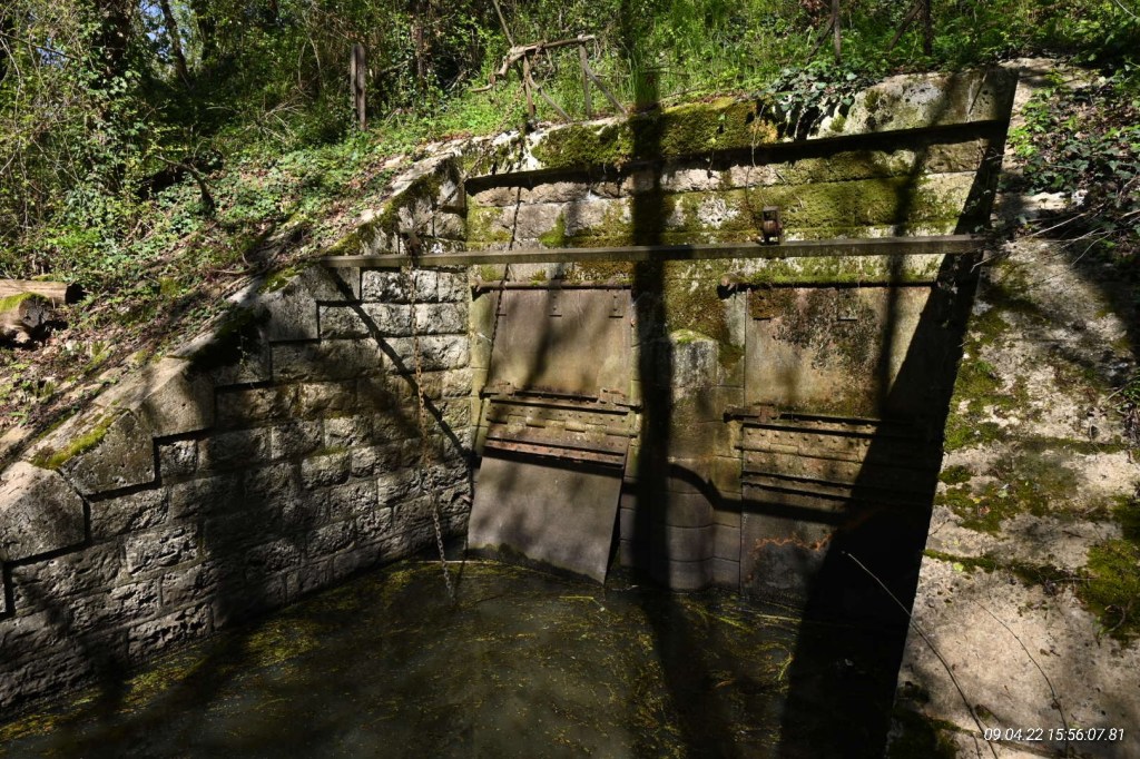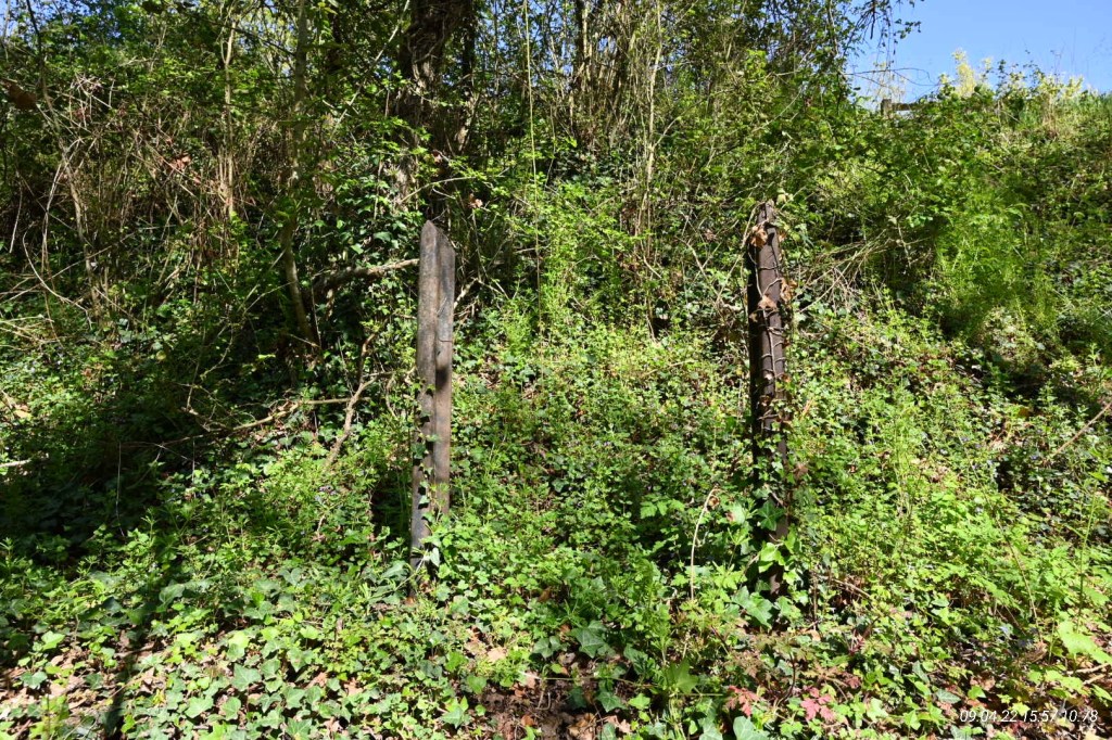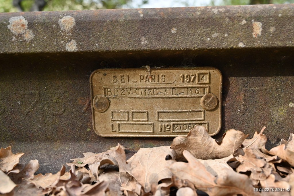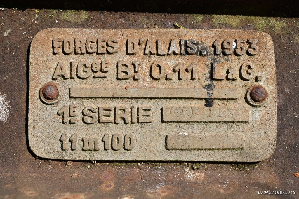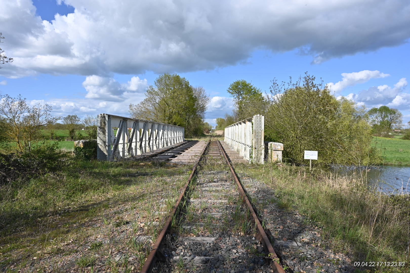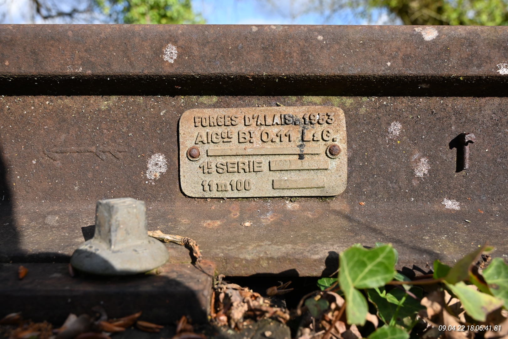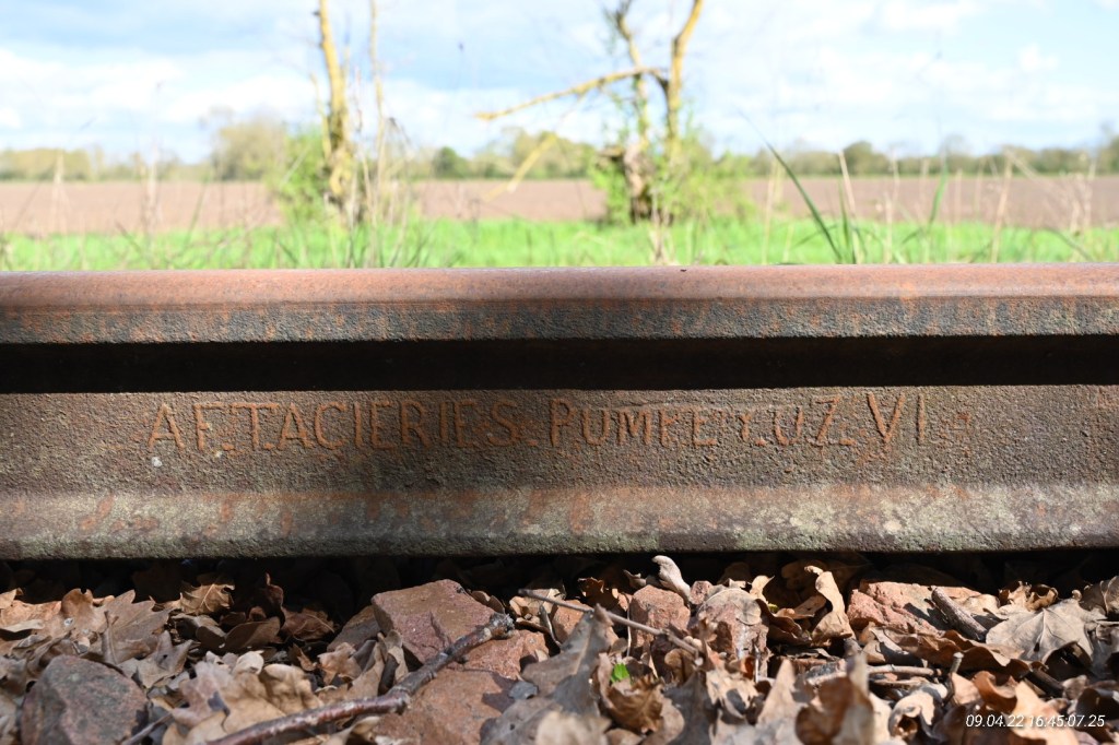 In St-Lambert des Leveés wird gerade die Straße saniert.Bahnübergang Nummer 199. Hier beginne ich meine Streckenwanderung.Langsam erobert die Natur den Bahndamm. Von einem regelmäßigen Zugverkehr keine Spur. Das Foto wurde in Richtung Saumur aufgenommen. Ein kleines Geländer neben dem Bahndamm macht mich stutzig. Dort Unten muss sich ein Durchlass im Bahndamm befinden. Tatsächlich finde ich an einem eher stehenden Gewässer einen Durchlass. Scheinbar konnte hier der Wasserdurchfluss reguliert werden.Unter der Vegetation ist eine kleine Treppe verborgen und der Zugang ist eingerahmt von zwei alten Schienen als Zaunpfähle. Wann wohl hier zuletzt die Stautore bedient wurden? Eine schöne kleine Entdeckung.Ab Bahnübergang 199 verläuft die Bahnlinie fast 6 Kilometer ohne Kurve in Nord/Süd-Richtung. Der Bahndamm ist stets zweigleisig errichtet worden, mehr als ein Gleis wurde hier aber nie verlegt. Die verwendeten Holzschwellen sehen noch recht brauchbar aus und auch am Schotter wurde nicht gespart. An Unterführungen für kreuzende Straßen ist der geplante – aber nie ausgeführte – Ausbau für das zweite Streckengleis gut zu erkennen. Das Stahldeck für ein eventuell zu errichtendes zweites Gleis wurde vielfach bereits eingebaut. Als Schienen sind hier die üblichen Stuhlschienen anzutreffen. Sie stammen aber nicht aus den Jahren vom Bau der Bahnlinie sondern wurden irgendwann später eingebaut. Die Schienen stammen von verschiedenen Walzwerken, haben aber alle den Zeitraum der Jahre1906 – 1909 als Herstellungsjahr gemein.