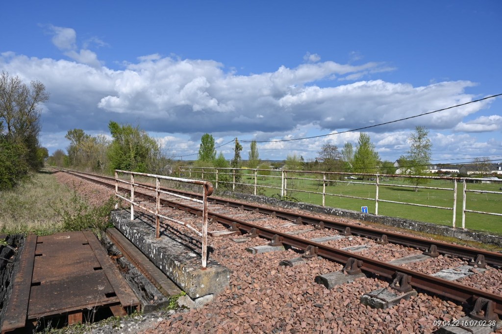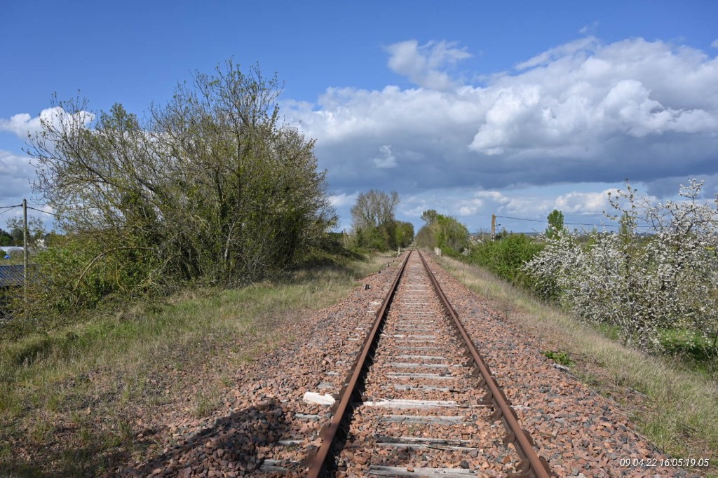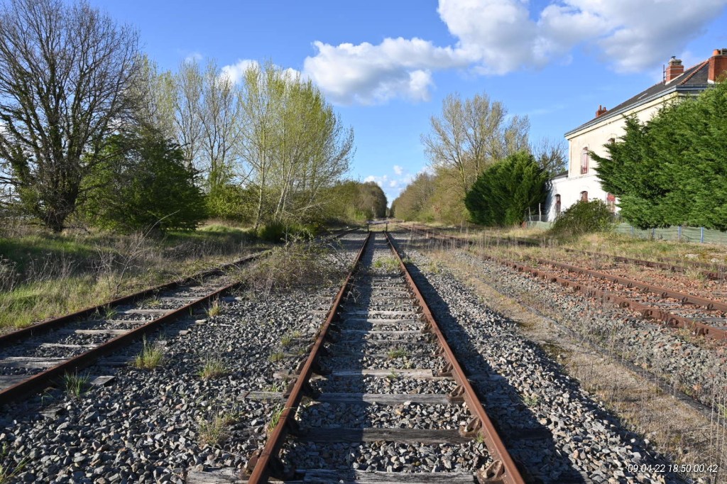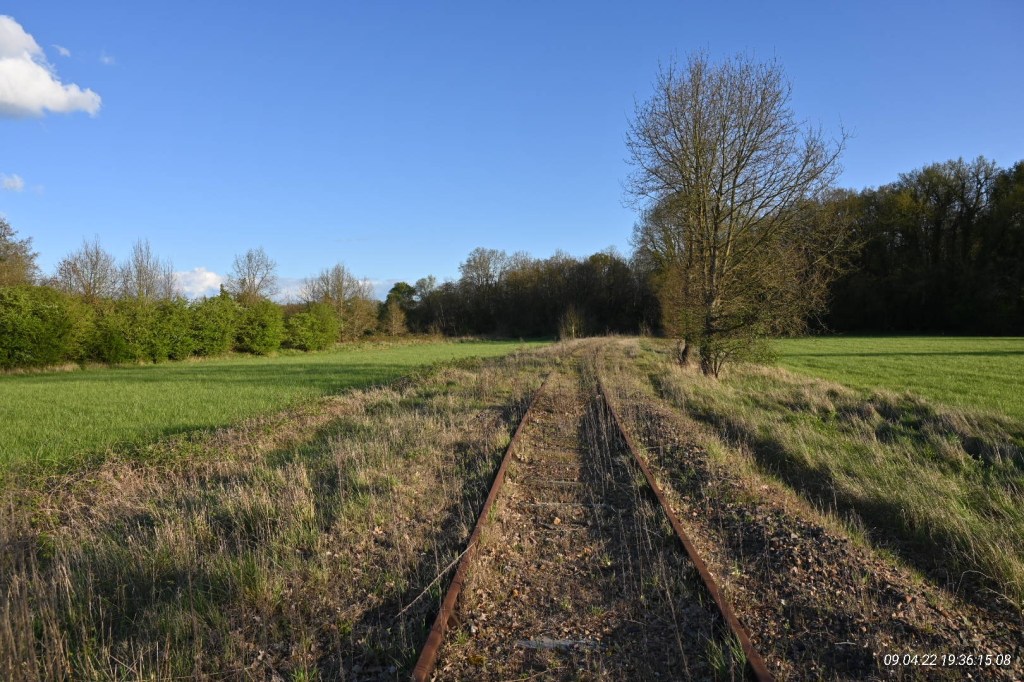 Ab dem Bahnhof Vivy führt die zweigleisig geplante, aber nur eingleisig gebaute Strecke nach Chartres weiter in Richtung Norden. Eine andere Strecke, auf der ich meine Wanderung fortsetze, hatte hier in Vivy ihren Ausgangspunkt: die Bahnstrecke nach La Fleche. Diese war eingleisig geplant und gebaut worden und verläuft Richtung Nordosten.