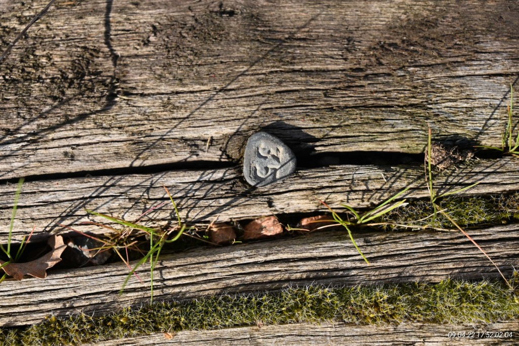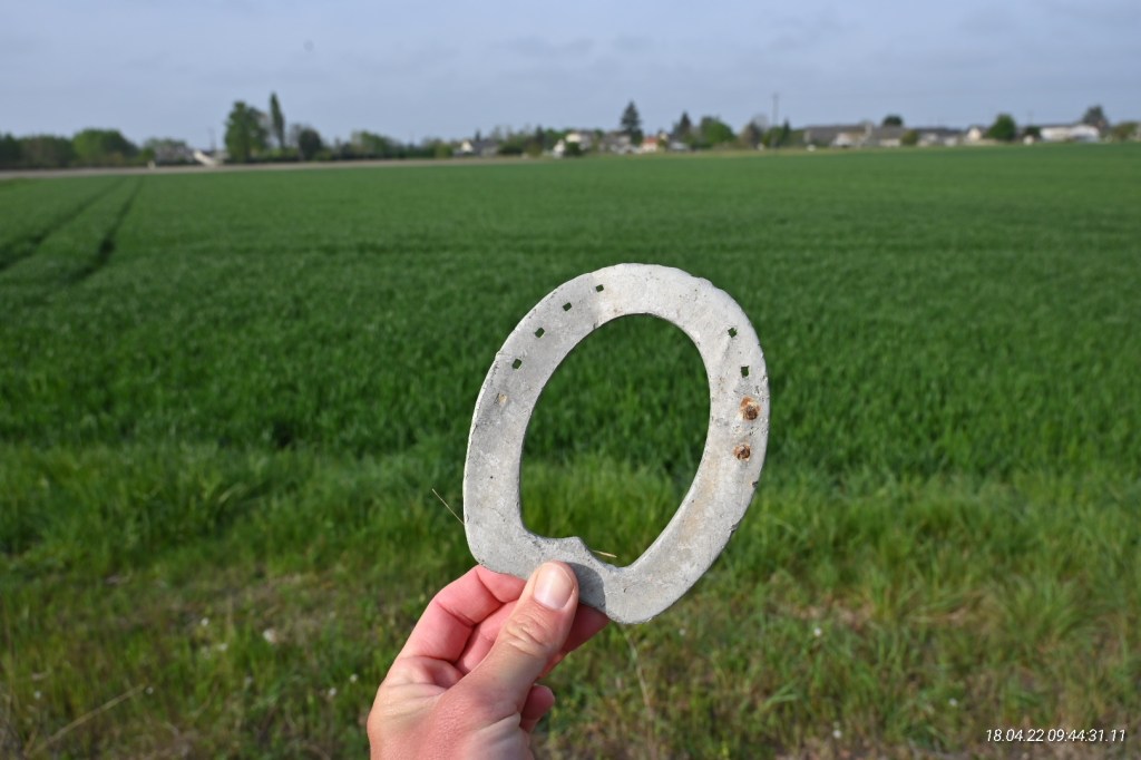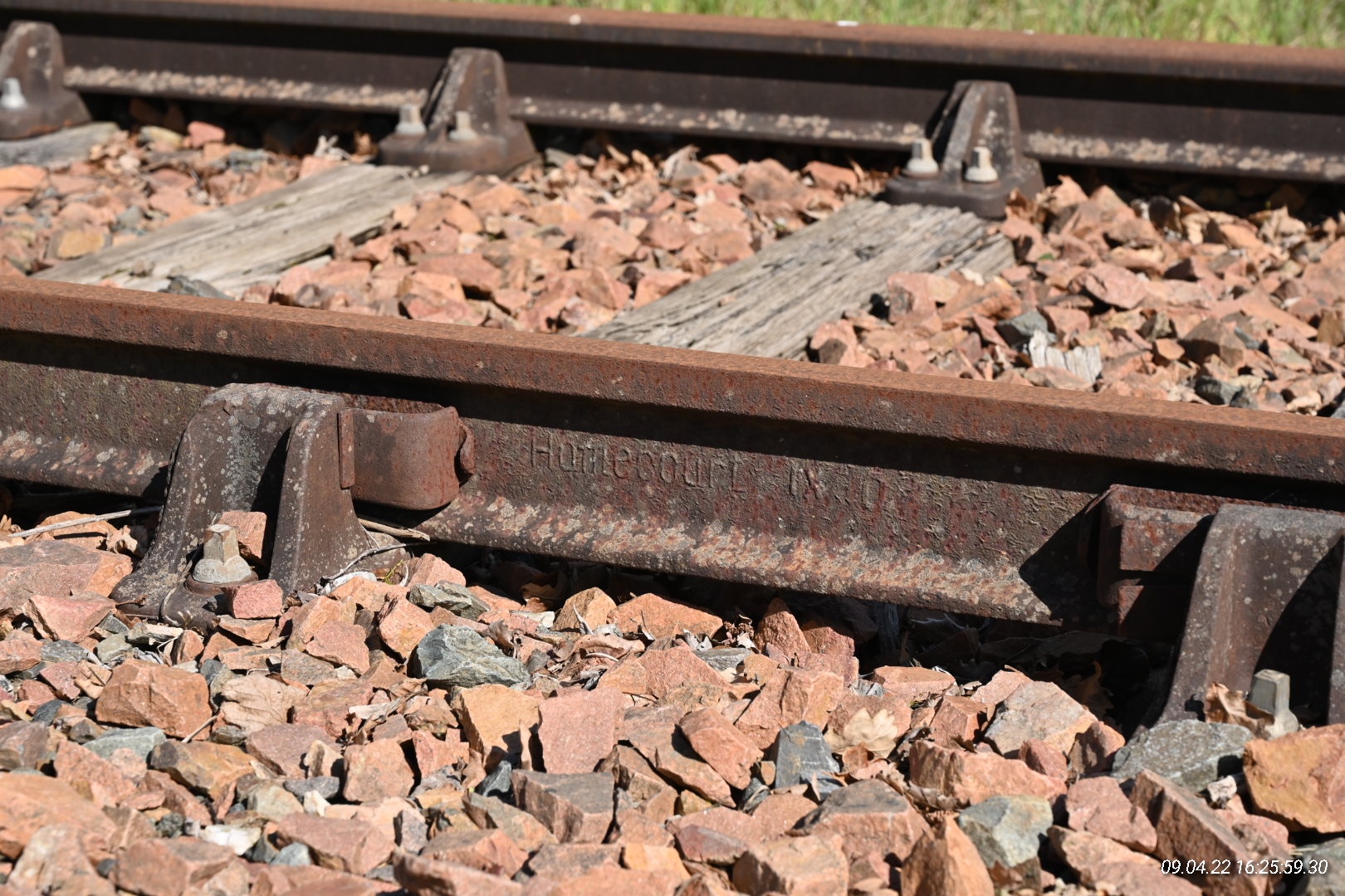 Blick zurück in Richtung Vivy. Die Natur erobert das Streckengleis zurück. Nach einer Übernachtung im Wald ging es am Folgetag wieder an die Strecke. Die Vegetation der Strecke war vorab schwer einzuschätzen. Einige Abschnitte waren noch ganz gut begehbar, andere wiederum nicht mehr so gut. Nachdem ich ab dem Bahnhof Vivy auf die Strecke nach La Fleche gewechselt habe, ist nun auch die Kilometrierung verändert. Sie beginn im Bahnhof von La Fleche bei Kilometer 0 und erreicht den Endpunkt im Bahnhof Vivy bei exakt Kilometer 44,462. Glück gehabt: Ein altes Hufeisen gefunden!Neben der Bahnlinie entstand später eine Autobahn. Hierdurch entfielen einige Bahnübergänge und dieser hier (Nummer 52) wurde durch eine Brücke ersetzt. Stellenweise wurden neuere Schienen eingebaut wie diese hier aus dem Jahr 1905 (Foto), ansonsten blieb es bei den Ursprungsschienen aus den 1880er Jahren.