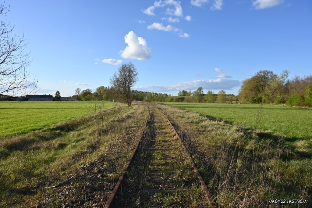 Hinter BahnübergangNummer 50 ist eines der beiden Getreidesilos bereits zu sehen. Ende der 80er Jahre kam ein zweites Silo hinzu, welches ebenfalls einen Gleisanschluß erhielt. Die Streckenwanderung endet hier relativ abrupt an einem Prellbock, der sich wenige 100m hinter der Weiche befinde.