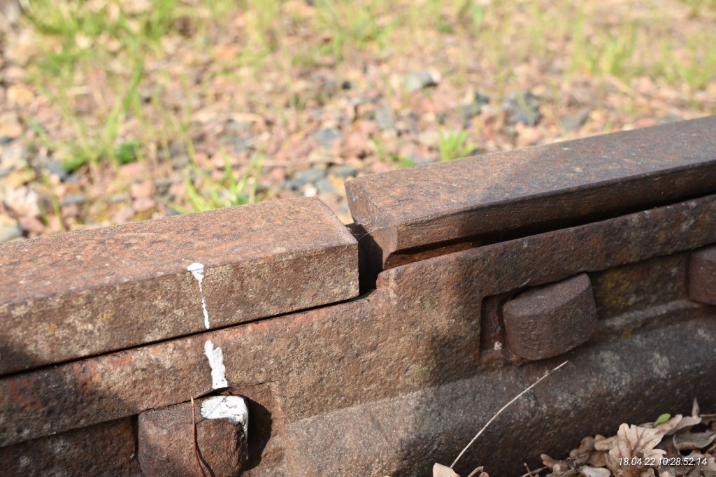 Beim Wechsel von Stuhlschienen auf Doppelkopfschienen musste eine entsprechend gestaltete Schienenlasche verwendet werden, wie diese hier (Foto). Deutlich ist der dickere Schienenkopf der Stuhlschiene (links) zu erkennen. Die Doppelkopfschiene (oder „rail double champignon“ am Französischen) ist wesentlich schlanker.Gerade an Bahnübergängen wurde vermutlich viel mit Pestiziden gearbeitet. So wächst hier auch Jahre später noch nicht sehr viel. Bahnübergang Nummer 50.