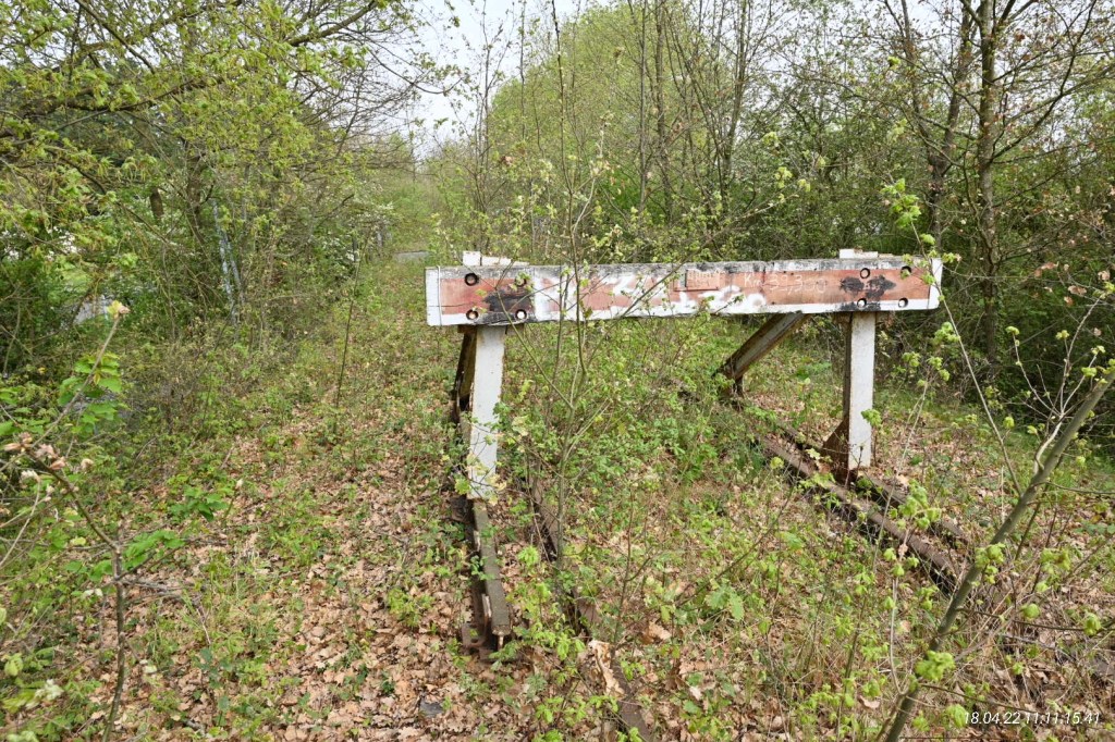 Schließlich wird die Weiche erreicht über die es zu zwei verschiedenen Gleisanschlüßen geht.Bei dieser Weiche ist das Jahr 1974 das Jahr der Herstellung.Der Anschluß zum neueren Silo führt in diesem umzäunten Bereich. Die letzte Bedienfahrt wird etwa 10 Jahre zurückliegen. Versucht man dem Streckengleis noch weiter in Richtung La Fleche zu folgen, so stößt man bereits wenige 100m später auf diesen Prellbock. Dahinter liegen wohl noch Gleise, aber alles ist so zugewachsen, dass hier zu Fuß kein Weiterkommen mehr möglich ist. Damit endet die recht kurze Streckenwanderung relativ unverhofft im Nirgendwo.