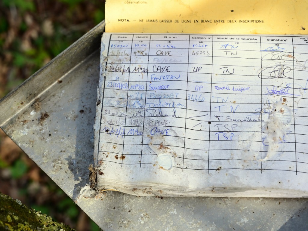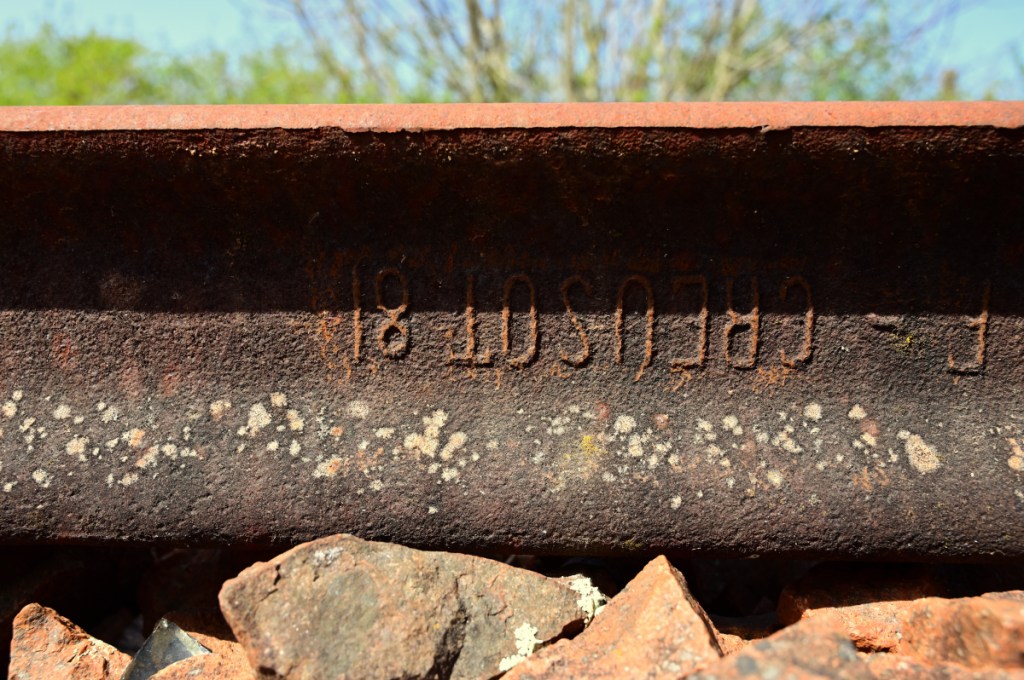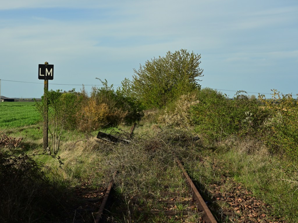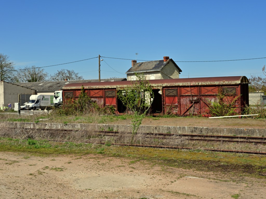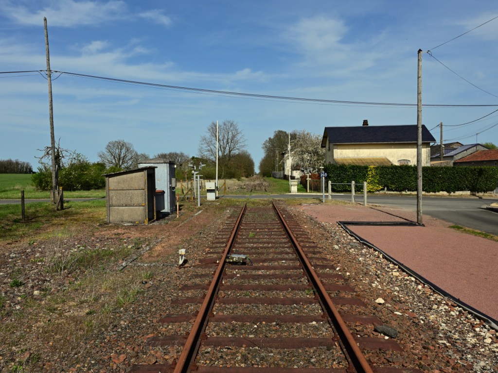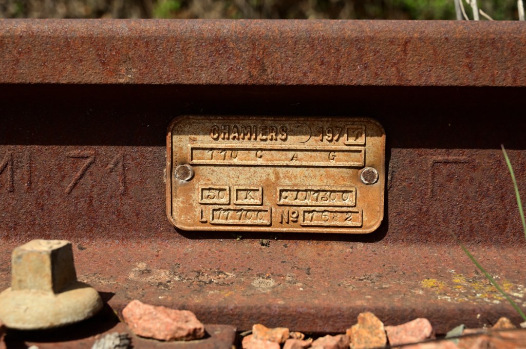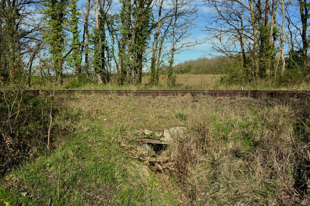Am Bahndamm konnte ich wegen der freigeschnittenen Böschung zur Ackerfläche herabsteigen und ein Foto von diesem kleinen Durchlass anfertigen. Viel war allerdings nicht zu sehen. Auf Stuhlschienen mit Stahlschwellen erreicht die Bahnlinie den Bahnübergang an der D759. Das Wärterhaus hat einen Anbau erhalten und wurde in der Wohnfläche deutlich erweitert. In ein paar seichten Kurven führt die Bahnlinie um einen kleinen See. Im Frühjahr 2021 war hier sämtliches Wasser verschwunden. Nun im Jahr 2022 waren Arbeiten für eine Renaturierung im Gange. Die Uferbefestigungen wurden erneuert und etwas Wasser ist auch schon wieder da. Der See liegt direkt am örtlichen Campingplatz von Loudun. Bahnübergang „193bis“ entstand durch eine neugebaute Umgehungsstraße und wurde mit dem Zusatz „bis“ zwischen den Bahnübergänge 193 und 194 angelegt.Bei der Einmündung der Bahnstrecke in den Ort Loudun war man bemüht Bahnübergänge zu vermeiden. Durch eine Höherlegung der Bahntrasse auf einen künstlichen Damm, entstanden 4 Brückenbauwerke. Auch diesen Brücken ist der vormalige zweigleisige Ausbau (1882 – 1942) noch gut anzusehen. Das begrenzende weiße Geländer zeigt auf der linken Bildseite deutlich die frühere Abmessung für eine zweigleisige Bahnstrecke. Manche der Signaltafeln sind vollständig unter dem Efeubewuchs verdeckt. Direkt neben der Bahnstrecke erinnert ein Torbogen mit alten Schienenstücken an einen ehemaligen Fußgängerüberweg. Die Bahnlinie erreicht den Bahnhof Loudun. Nicht nur die von mir besuchte Strecke führte hier entlang: Es gab auch eine Strecke von hier nach Angers (83km lang; eröffnet 1872) und eine weitere nach Châtellerault (49km lang; eröffnet 1886). Der Bahnhof war entsprechend großzügig ausgebaut. Von der damaligen Größe ist heute nicht mehr viel zu sehen. Viele Gleise mussten einem Industriebetrieb weichen. Für eine Stadt mit heute knapp 6.00 Einwohner ist der Bahnhof beachtlich groß. Als Knotenbahnhof von dem aus Züge in vier verschiedene Richtungen abgingen, war ein entsprechend dimensionierter Bahnhof angelegt worden. Das Bahnhofsgebäude von Loudun liegt zentral am Ende der Rue de la Gare, der Bahnhofsstraße. Nachdem der Personenverkehr im Jahr 1970 endete, passierten über viele Jahre nur noch die Getreidezüge von/ nach Beuxes den Bahnhof. Aus welchem Grund auch immer: Im Bahnhof ist ein gedeckter Güterwagen gestrandet. Der Wagen sieht dabei merkwürdig niedrig aus: Er hat keine Räder (Achsen) mehr.Verläßt man den Bahnhof weiter in Richtung Beuxes wie ich es auf meiner Reise tat, so sind am Ortsausgang die Reste dreier Gleisanschlüße zu erkennen. Die Gleisanlagen sind noch vollständig. Gepflegt sieht aber anders aus. An einer der Anschlußweichen ist am Schienensteg diese kleine Plakette befestigt. Seit zwei Jahren suche ich an Weichen systematisch nach diesen kleinen Details: Demnach stammt die Weiche aus dem Jahr 1971. Auch die Schiene selbst trägt ein Walzzeichen mit dieser Jahreszahl. Nachdem nun bereits die Gleianschlüße passiert worden, geht es scheinbar auf einer zweigleisigen Bahnstrecke aus der Stadt Loudun heraus. Doch der Eindruck täuscht: Es handelt sich in Wirklichkeit um zwei eingleisige Bahnlinien, die zufällig für knapp 1km nebeneinander liegen und erst danach in unterschiedliche Richtungen führen. Die Strecke rechts im Bild führte bis nach Châtellerault. Zuletzt sah sie nur noch Güterverkehr bis nach Le Bouchet (10km). Dieser Verkehr endete im Jahr 2010.Auf der im Jahr 1886 eröffneten Bahnstrecke Châtellerault wurden scheinbar niemals in größeren Umfang die Schienen getauscht. So liegen hier heute noch Schienen aus dem Jahr 1881. Diese im Foto oben wurde in Creusot gewalzt: Ein Produktionsort, der auf alten Schienen sehr häufig zu finden ist. Vermutlich war auch auf dieser Strecke der immense Wartungsstau schließlich ein entscheidener Grund für das Ende des Güterverkehrs im Jahr 2010. Der Personenverkehr wurde schon im Jahr 1939 eingestellt. Schließlich driftet das Streckengleis nach Châtellerault etwas zur Seite und verschwindet im dichten Gebüsch.Ein Feldweg kreuzt die Bahnstrecke auf einer kleinen Rundbogenbrücke. Mit etwas Fantasie kann man sich auch hier einen zweigleisigen Verlauf denken. Tatsächlich war dieser Abschnitt immer eingleisig geblieben. Ohne weitere Besonderheiten verläuft die Bahnstrecke weiter in Richtung Norden. Besondere Kunstbauten waren nicht anzutreffen. Bei Streckenkilometer 182,9xx befindet sich der Bahnhof von Basses-Sammarçolles. Er diente beiden Ortschaften gleichermaßen bis zum Jahr 1970 als Tor zur Welt. Alle nicht mehr relevanten Überhol,- und Abstellgleise wurden entfernt. Der Güterschuppen ist noch an Ort und Stelle, doch sein Dach ist teilweise eingestürzt. Das eigentliche Bahnhofsgebäude dagegen ist als normales Wohnhaus erhalten geblieben. Ein kleines Schmankerl fand sich in einem Blechkasten: Hier sind in einem kleinen Heft die Kontrollgänge der Streckengeher eingetragen worden. Der letzte Eintrag wurde im Jahr 2007 notiert.Einige Abschnitte des Streckenoberbaus sind optisch in einem recht guten Zustand: Der Schotter ist nicht allzu alt, die Vegetation nicht sehr ausgeprägt und die Schienen? Naja die sind trotzdem über 100 Jahre alt. Bei Bahnübergang 207 ist als gut sichtbare Ortsmarke nun das Getreidesilo zu erkennen, bis zu dem im Jahr 2019 die letzten Züge fuhren. Die Anlagen sind nun verwaist. Einen Zugverkehr weiter in Richtung Chinon und Tours gibt es seit dem Jahr 1992 nicht mehr. Beim Getreidesilo in Beuxes sind mehrere Gleise nebeneinander anzutreffen, die nun alle seit 2019 keinen Zug mehr gesehen habe. Die Rangier,- und Ausziehgleise wachsen nun langsam zu. Dem eigentlichen Streckengleis (die Linie ging weiter über Chinon bis nach Tours) ergeht es da schon wesentlich schlechter: Durchgehend wurde hier zuletzt im Jahr 1992 ein Zug gefahren. Hier an dieser handbedienten Weiche endet nach 25m das Anschlußgleis an einem Pr