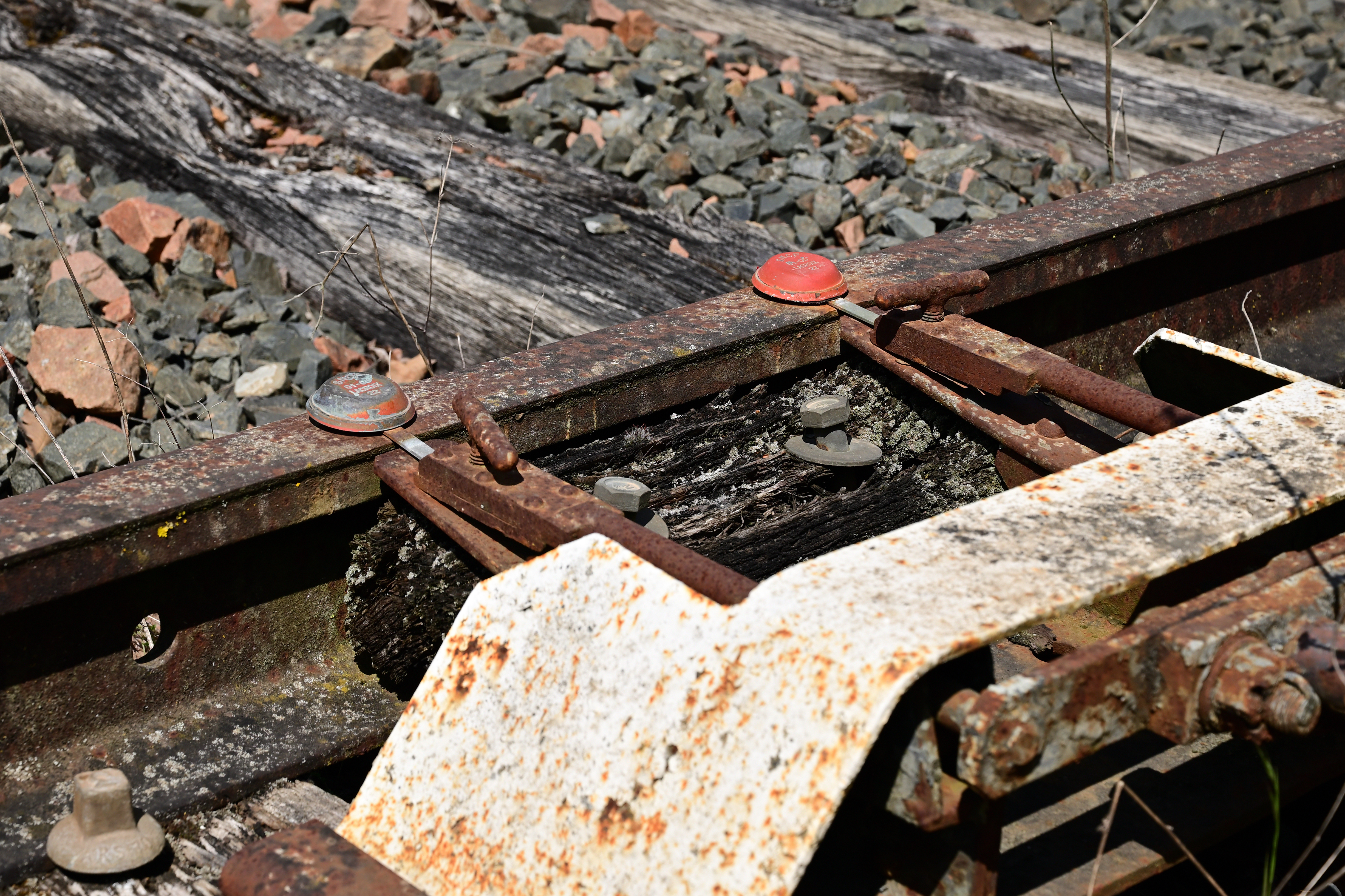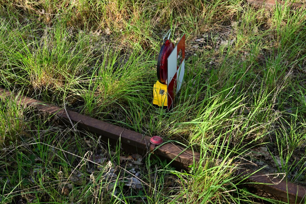 Offensichtlich stehen die Stromleitungen noch unter Strom und die Gleiskontakte der Bahnübergänge sind weiterhin aktiv. Um eine versehentliche Aktivierung der Schranken auszuschließen, wurden die Kontakte durch zwei halbe Blechtonnen abgedeckt.