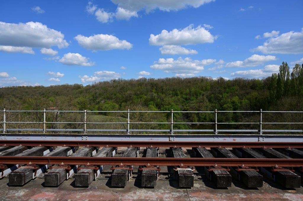 Auf dem 60m langen Viaduc d’Airvault. Von der Seite sieht man die massiven Brückenbalken. Die Schienen sind garnichtmal so alt.