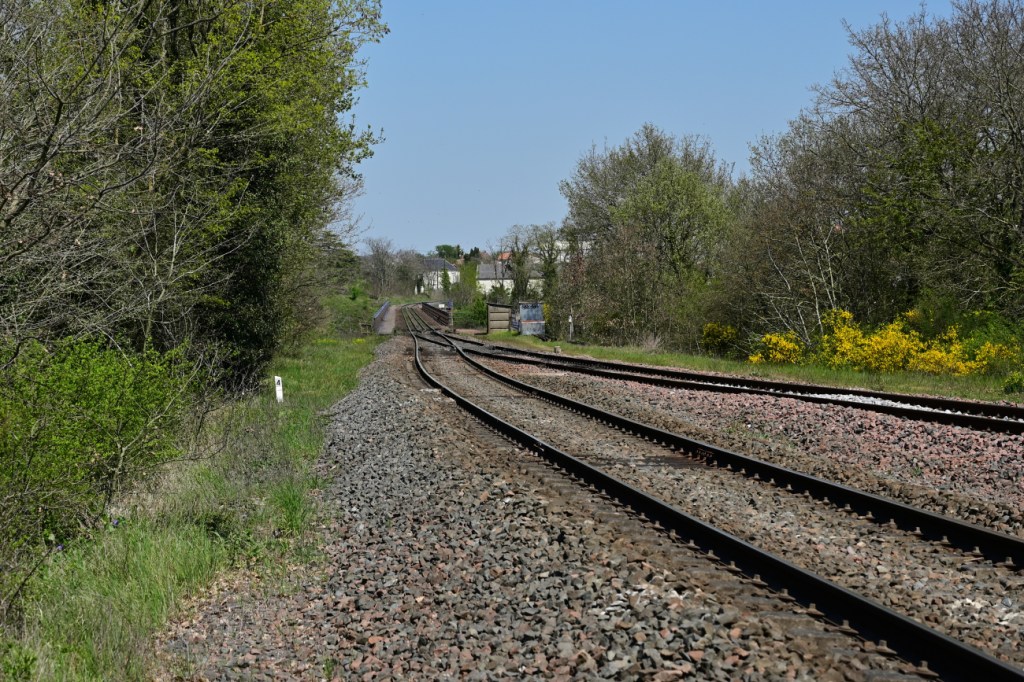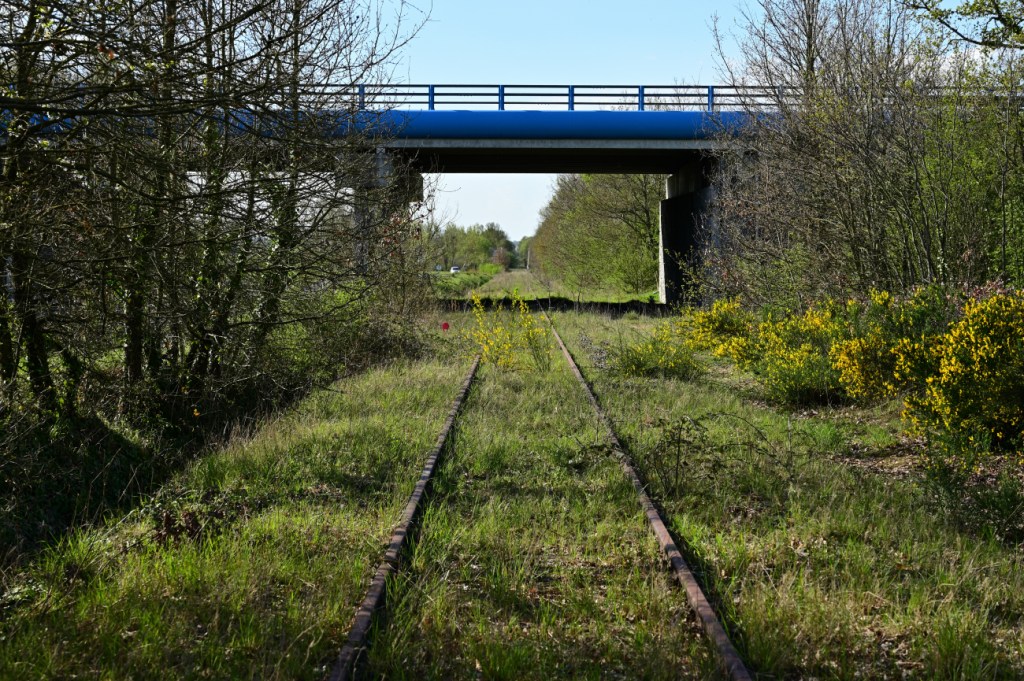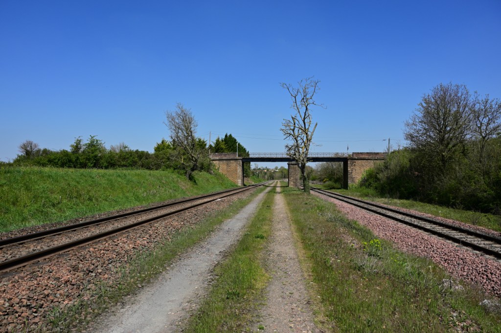 Hinter dem Viaduc d’Airvault wechselt das Streckengleis wieder von der rechten Seite hinüber zur linken Seite. Der Fußweg neben der Strecke wechselt also auch wieder die Seite.