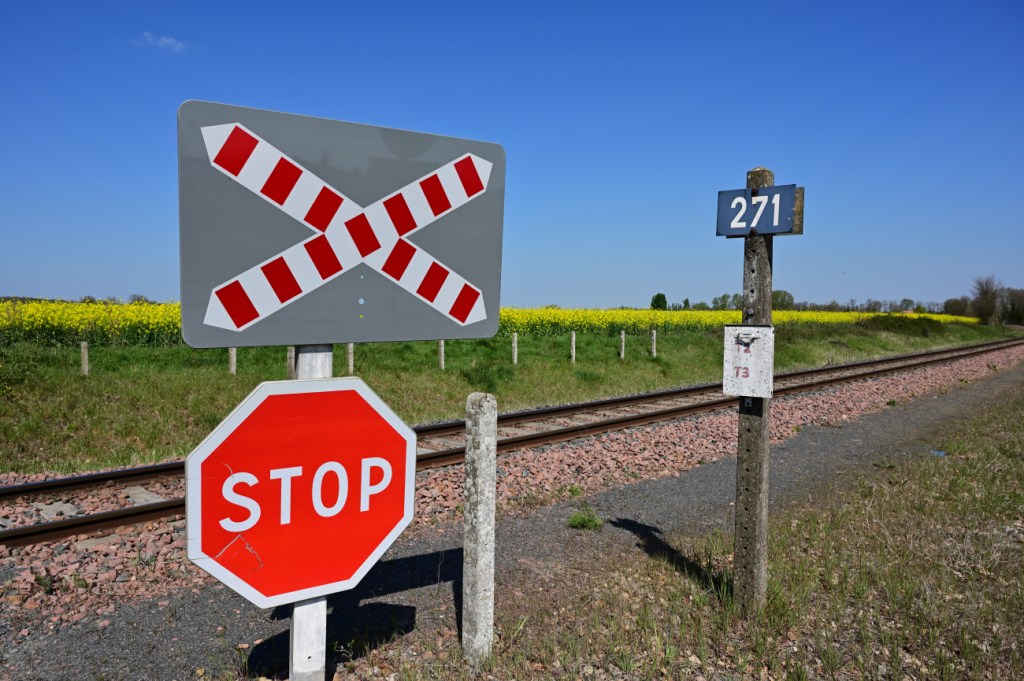 Bahnübergang Nummer 271. Am Mast mit dem Nummernschild ist ein kleiner Blechkasten zu sehen. Hier werden oft Dokumente der Streckengänger hinterlegt. In einem kleinen Buch wird Protokoll über die Kontrollgänge geführt.