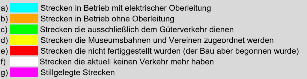 Mit dieser farblichen Unterteilung kann ich schnell einzelne Strecken markieren oder ihren einzelnen Status erkennen. Für Streckenwanderungen in Frage kommen somit die Strecke in der Farbe weiß und lila. Schmalspurstrecken, bzw alles kleiner 1435mm sind in der Farbe schwarz gehalten. Da dieses Netz fast vollständig außer Betrieb ist, werden alle diese Strecken „schwarz“ dargestellt, auch wenn sie noch in Betrieb sind.
